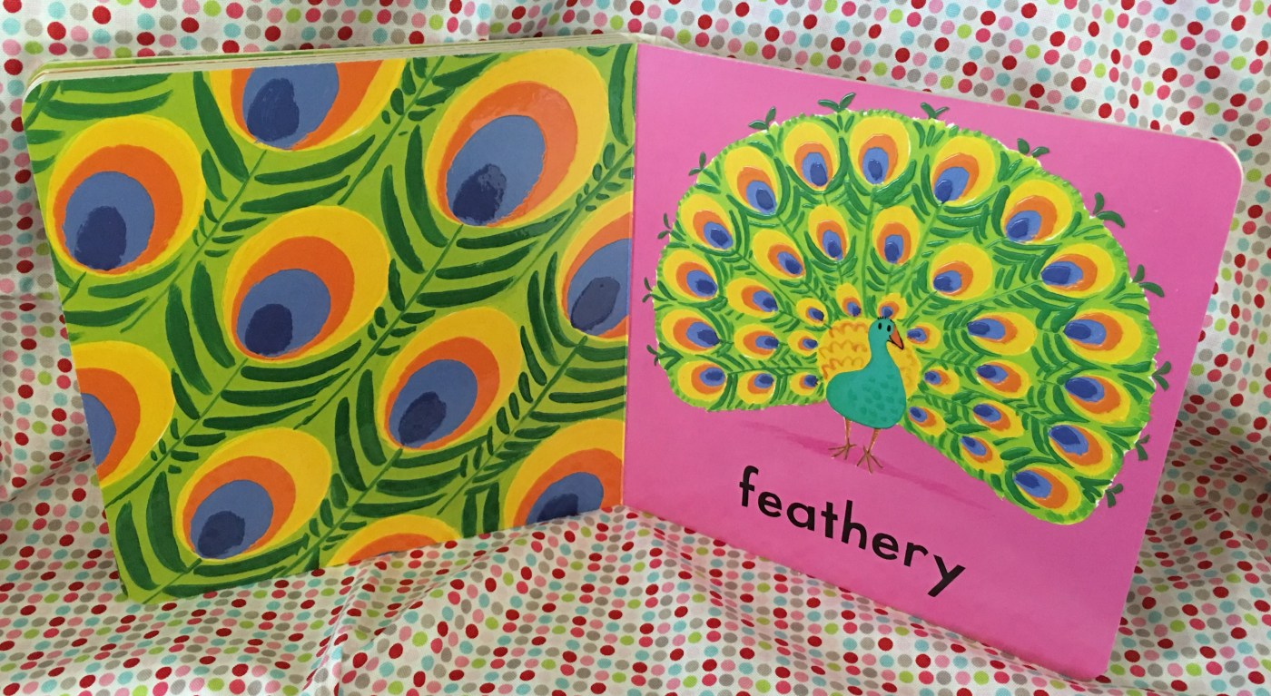 The animals book is delightful, with more texture for the babies to run their hands over. This book not only gives you the opportunity to talk about textures, animals and the noises they make, and looking at colours but also pointing out shapes. For example circles on the frog page and lines on the spiky echidna.